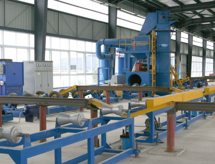 拋丸器選用向上拋丸安置。因為管徑不一樣鋼管在輥道上運送時其底面大致處于一樣的高度,拋丸器從下向上拋射,彈丸到鋼管外表的距離根本一樣,鋼丸抵達工件外表的拋射速度一樣,確保不一樣管徑的鋼管對外表的整理作用都一樣。為后續的噴涂供給一樣的條件。